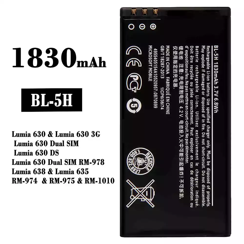 Battery model BL-5H for Nokia Lumia 630 / Lumia 630 3G / Lumia 630 Dual SIM / Lumia 630 DS / Lumia 630 Dual SIM RM-978 / Lumia 638 / Lumia 635 / RM-974 / RM-975 / RM-1010